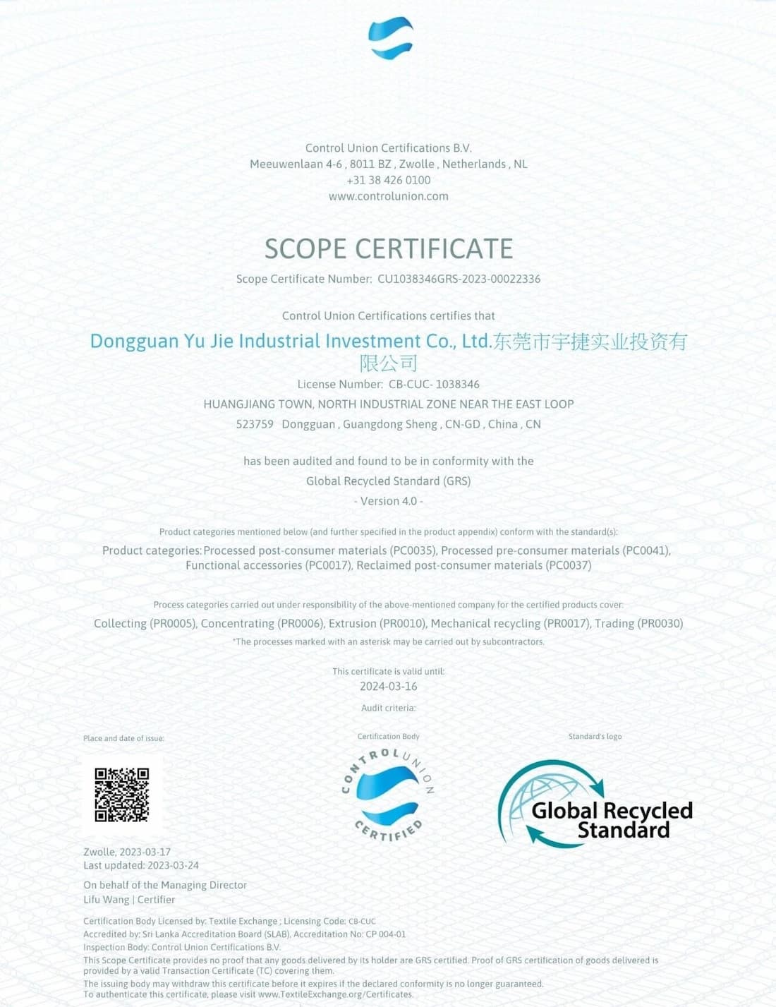 Yujie PCR has passed GRS、OBP、UL2809、ISCC、Carbon Footprint Certifications,