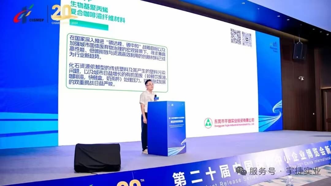 As a representative provincial-level SSDN enterprise, Dongguan Yujie Industrial Investment Co., Ltd. (hereinafter referred to as Yujie Industrial) showcased its latest R&D achievement – the "Bio-based Polypropylene Composite Material with Spent Coffee Ground Fiber" – at the fair. The company was honored to present this innovative product on the official new product launch stage, introducing it and its practical application cases to a global audience through media exchanges and live-streaming activities.