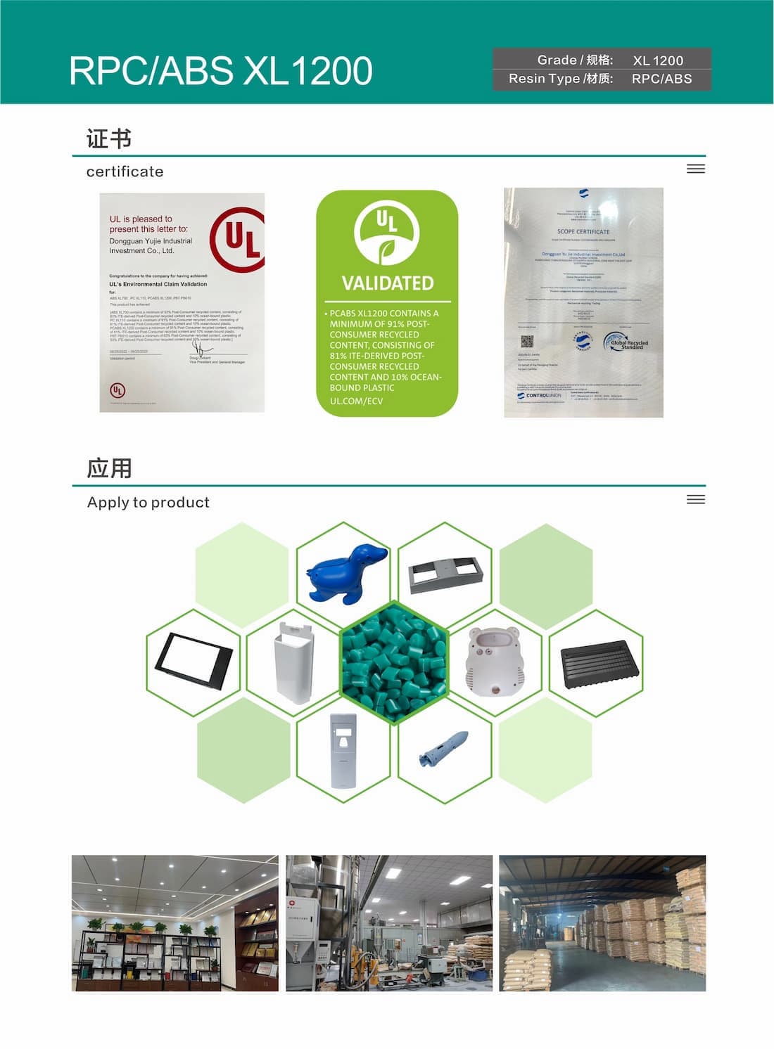 Yujie Industrial RPC/ABS or Recycled PC/ABS (PCR-PC/ABS), is an environmentally friendly alloy made from post-consumer recycled materials through modification.